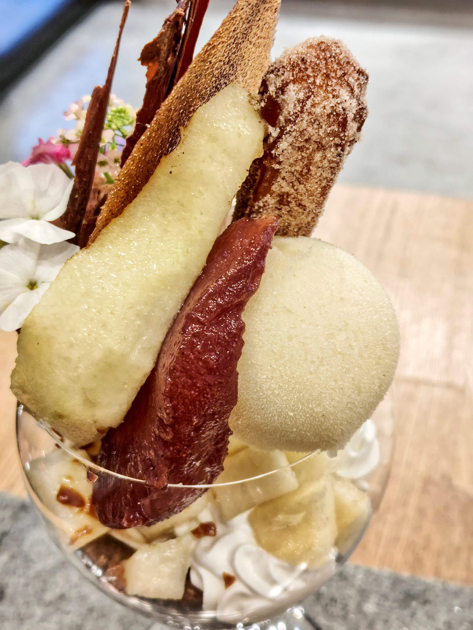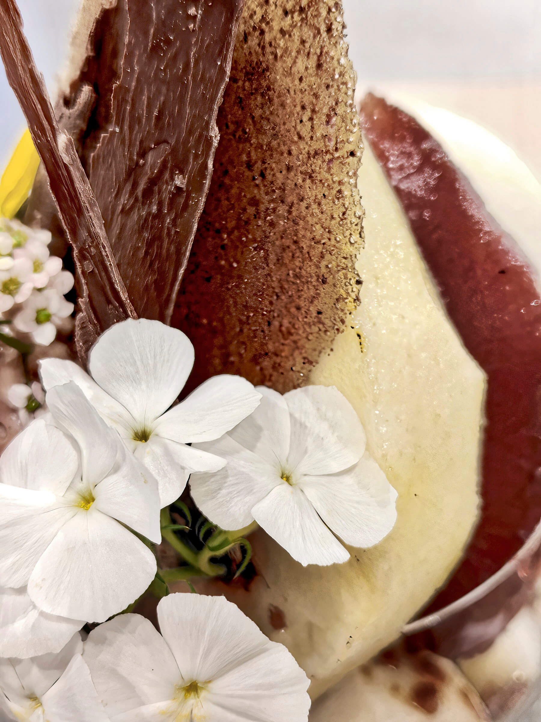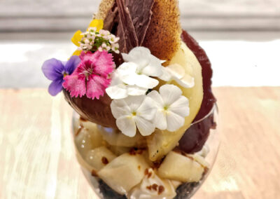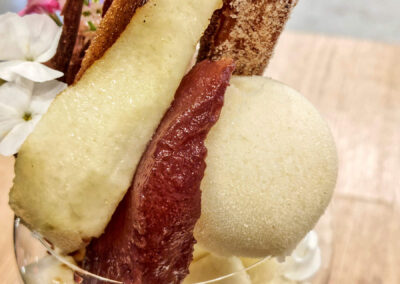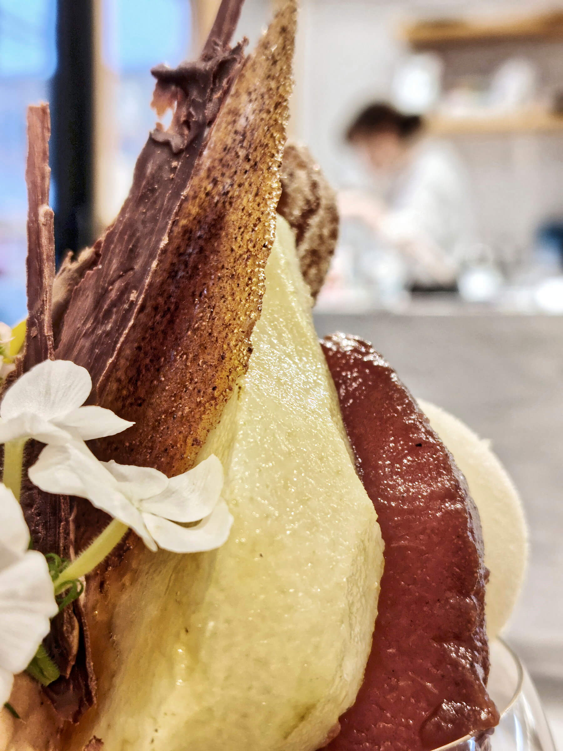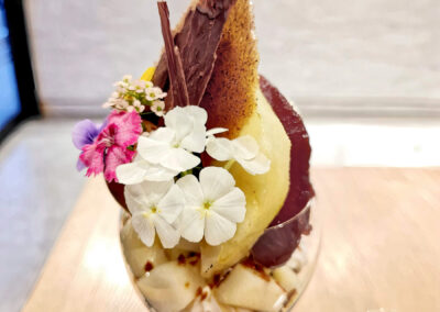 キャラメリゼ、ソルベ、赤ワインコンポート、